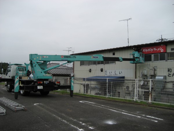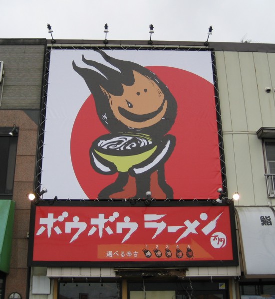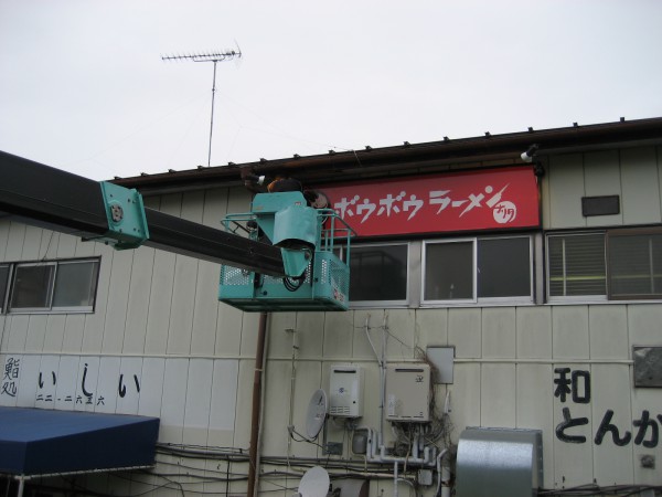 新規開店のらーめん屋の看板工事 欄間看板と壁面看板 約4m角のターポリン幕で遠くからでも目立ちます!