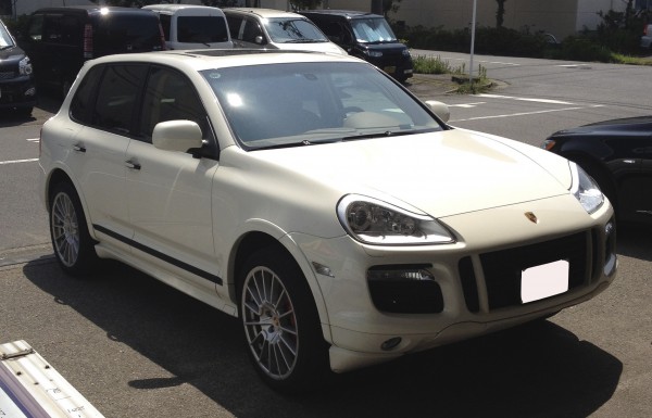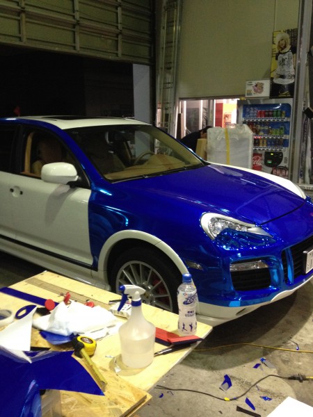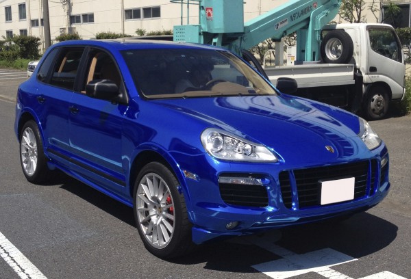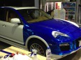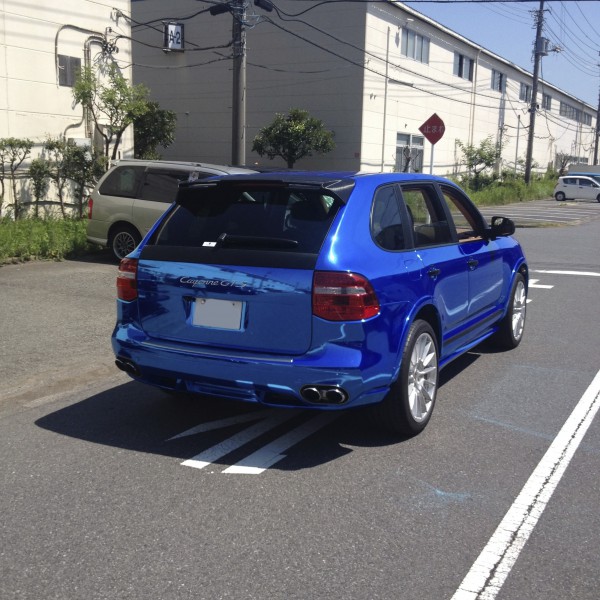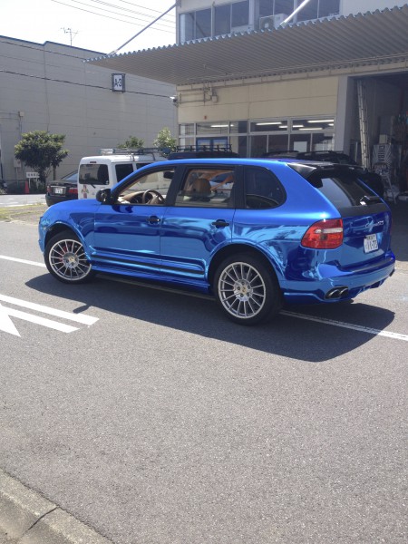 白いカイエンをビカビカのクロームブルーにカラーチェンジしました。