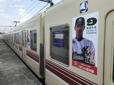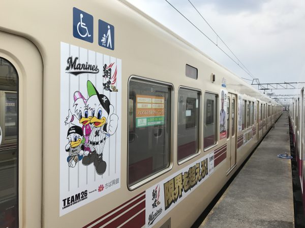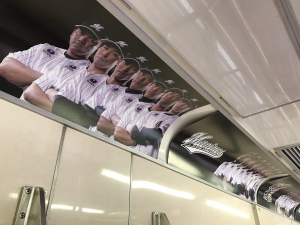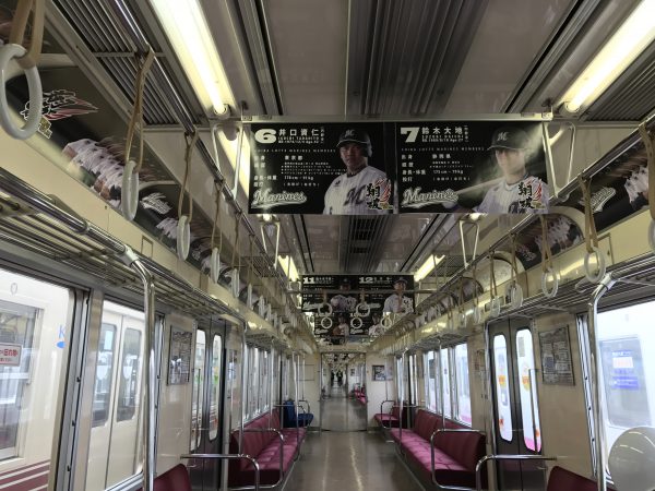 外のラッピングと中刷り広告で車両がチーム1色になりました。